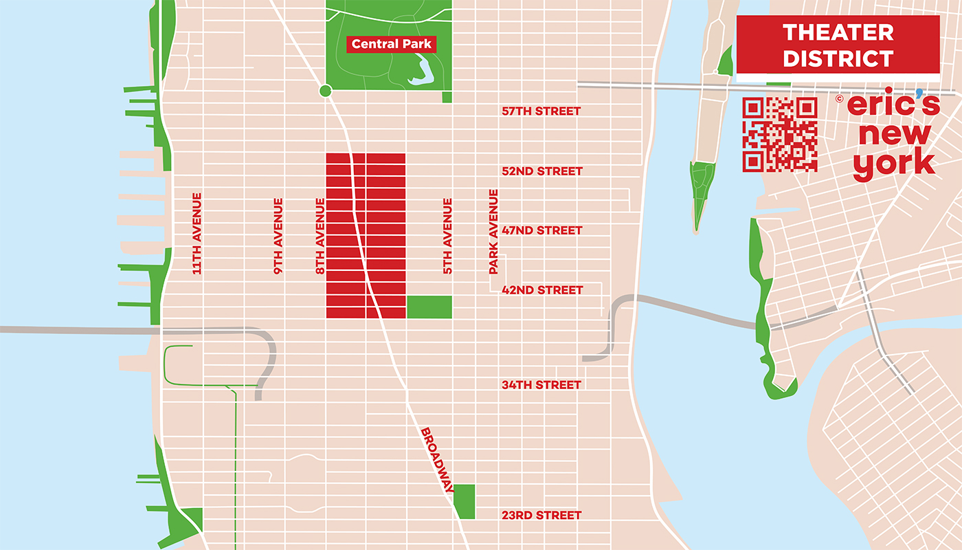 Teaterdistriktet i New York är hjärtat av stadens underhållning. Theater District sträcker sig från West 40th Street till West 54th Street och West 6th Avenue till östra 8th Avenue. Broadway åker genom området. Det sträcker sig även över det berömda Times Square. Många av teatrarna i New York finns i denna del av Manhattan. Förutom Broadway-shower finns det flera andra saker att göra i Theater District.